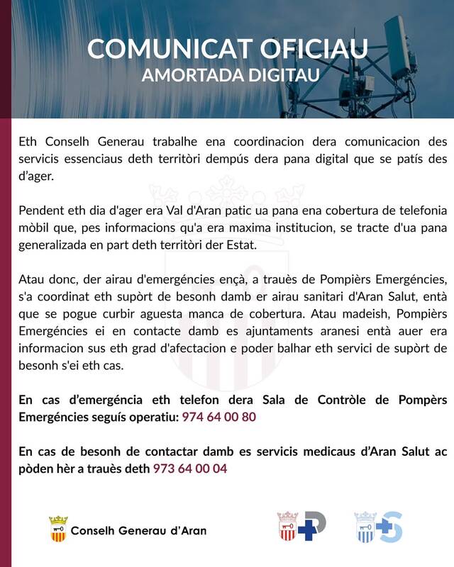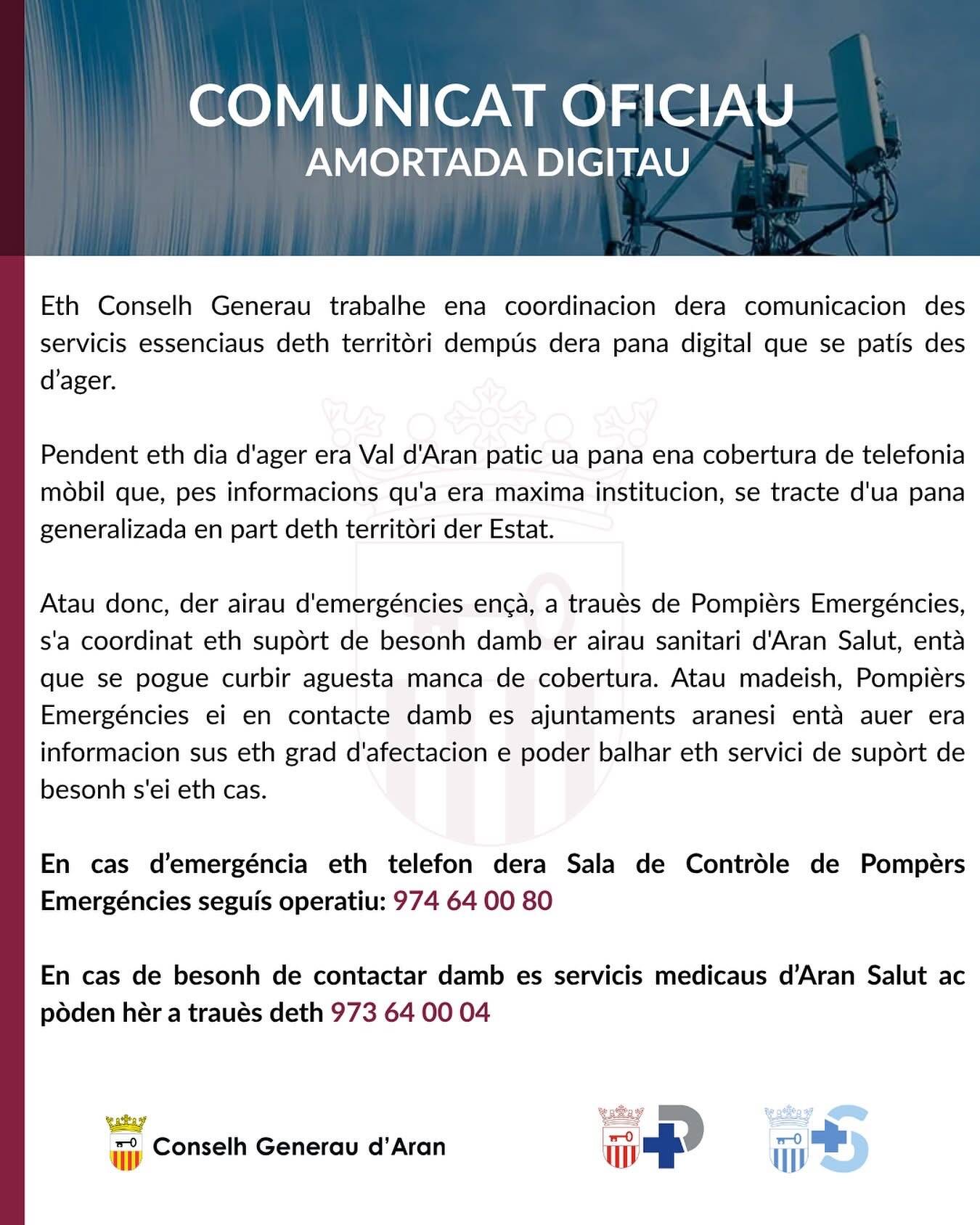 Pendent eth dia d’ager era Val d’Aran patic ua pana ena cobertura de telefonia mòbil que, pes informacions qu’a era maxima institucion, se tracte d’ua pana generalizada en part deth territòri der Estat.
