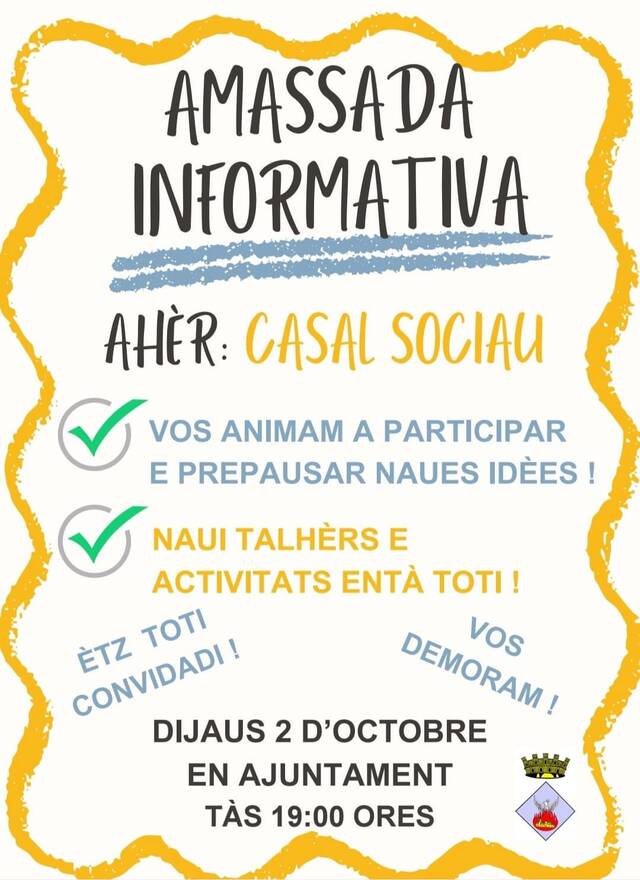 Volem convidar-te a participar en ua amassada dubèrta a on parlaram sus eth futur deth Casal Sociau, un espaci d'amassada e convivéncia. Serà ua oportunitat entà compartir idèes, besonhs e prepauses que mos ajuden a dar forma a un projècte comun.